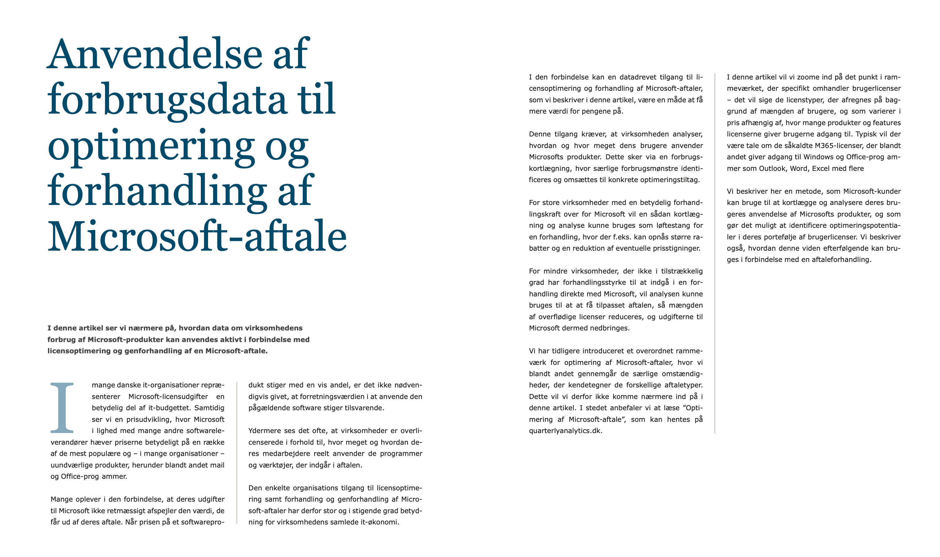 I denne artikel ser vi nærmere på, hvordan data om virksomhedens forbrug af Microsoft-produkter kan anvendes aktivt i forbindelse med licensoptimering og genforhandling af en Microsoft-aftale