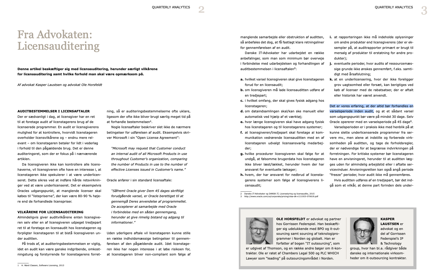 I denne artikel ser advokat Kasper Laustsen og Ole Horsfeldt nærmere på licensauditering, herunder særligt vilkårene for licensauditering samt hvilke forhold man skal være opmærksom på.
