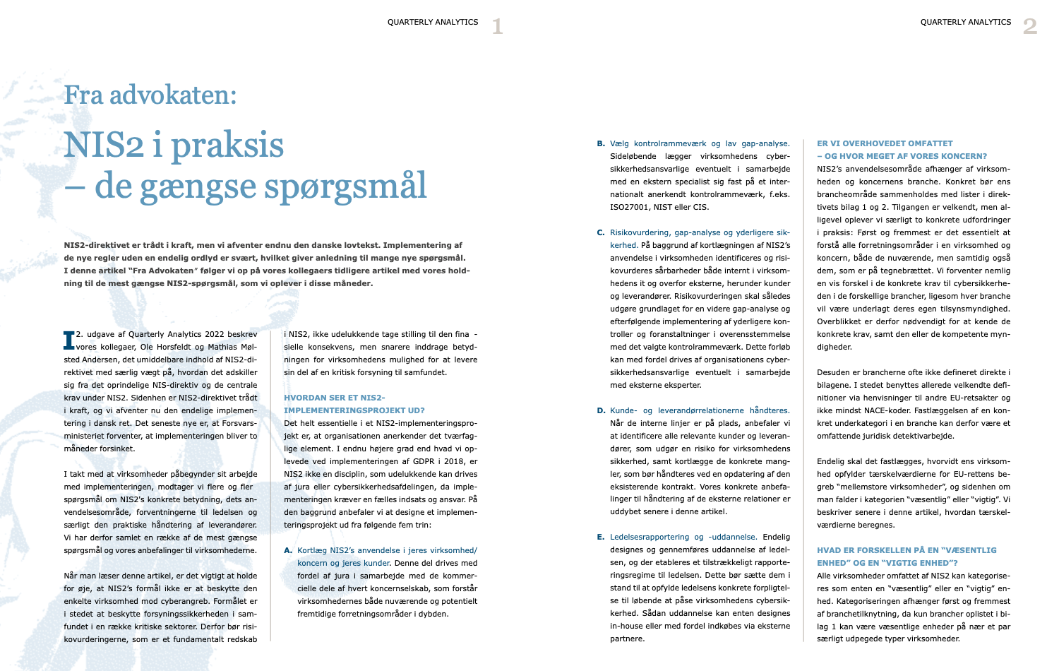I denne artikel gives der svar på en række af de mest gængse spørgsmål, der melder sig i forbindelse med implementering af NIS2. Derudover gives en række anbefalinger til de virksomheder, der står over for et NIS2-implementeringsprojekt.