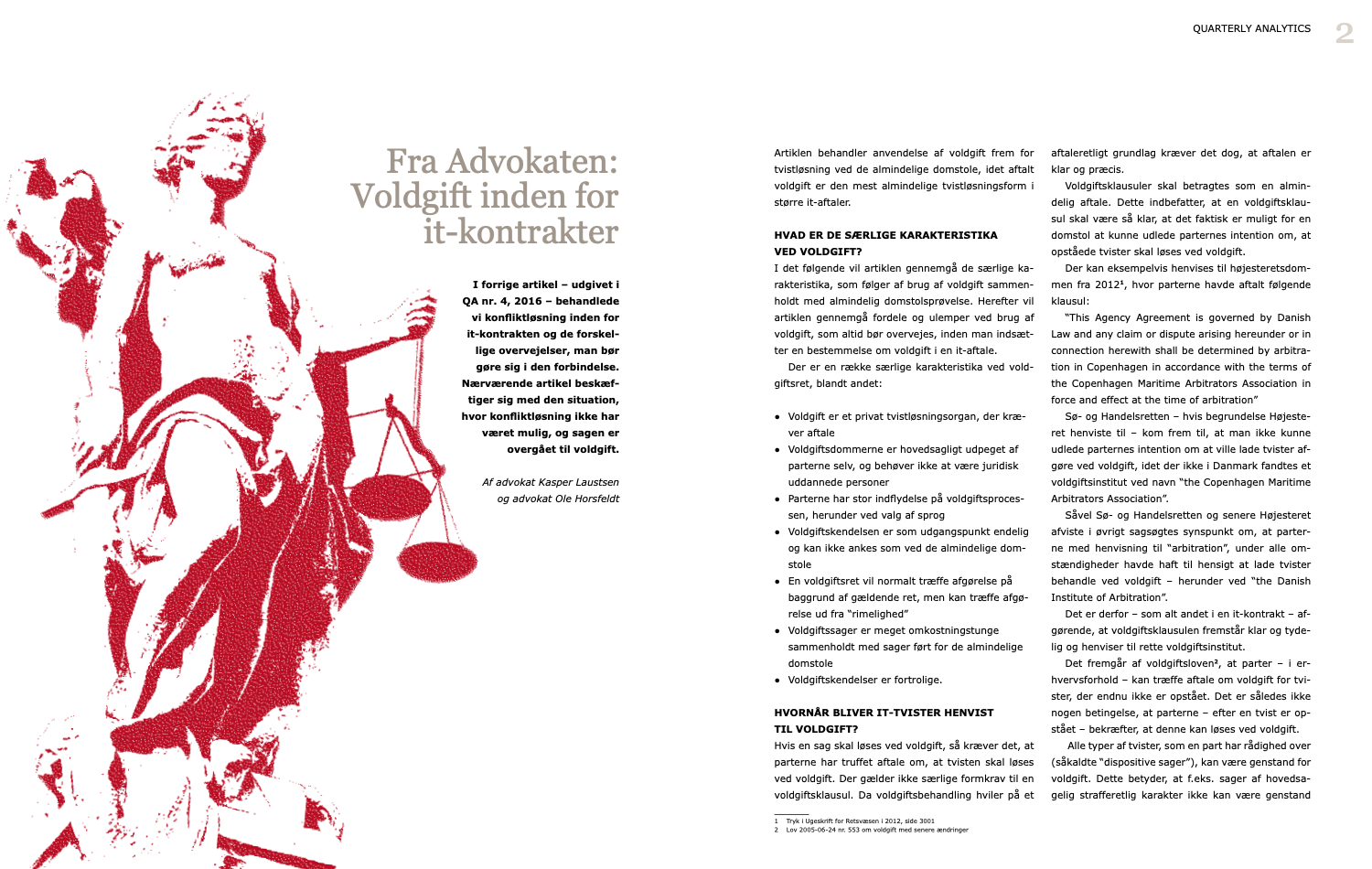 I artiklen gennemgås de særlige karakteristika, som følger af brug af voldgift sammenholdt med almindelig domstolsprøvelse. Derudover gennemgås fordele og ulemper ved brug af voldgift, som altid bør overvejes, inden man indsætter en bestemmelse om voldgift i en it-aftale.