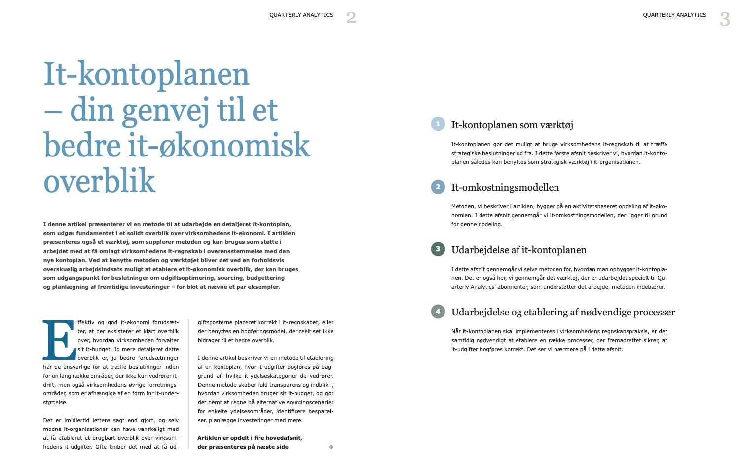 I denne artikel beskriver vi en metode til etablering af en kontoplan, hvor it-udgifter bogføres på baggrund af, hvilke it-ydelseskategorier de vedrører. Denne metode skaber fuld transparens og indblik i, hvordan virksomheden bruger sit it-budget, og gør det nemt at regne på alternative sourcingscenarier for enkelte ydelsesområder, identificere besparelser, planlægge investeringer med mere.