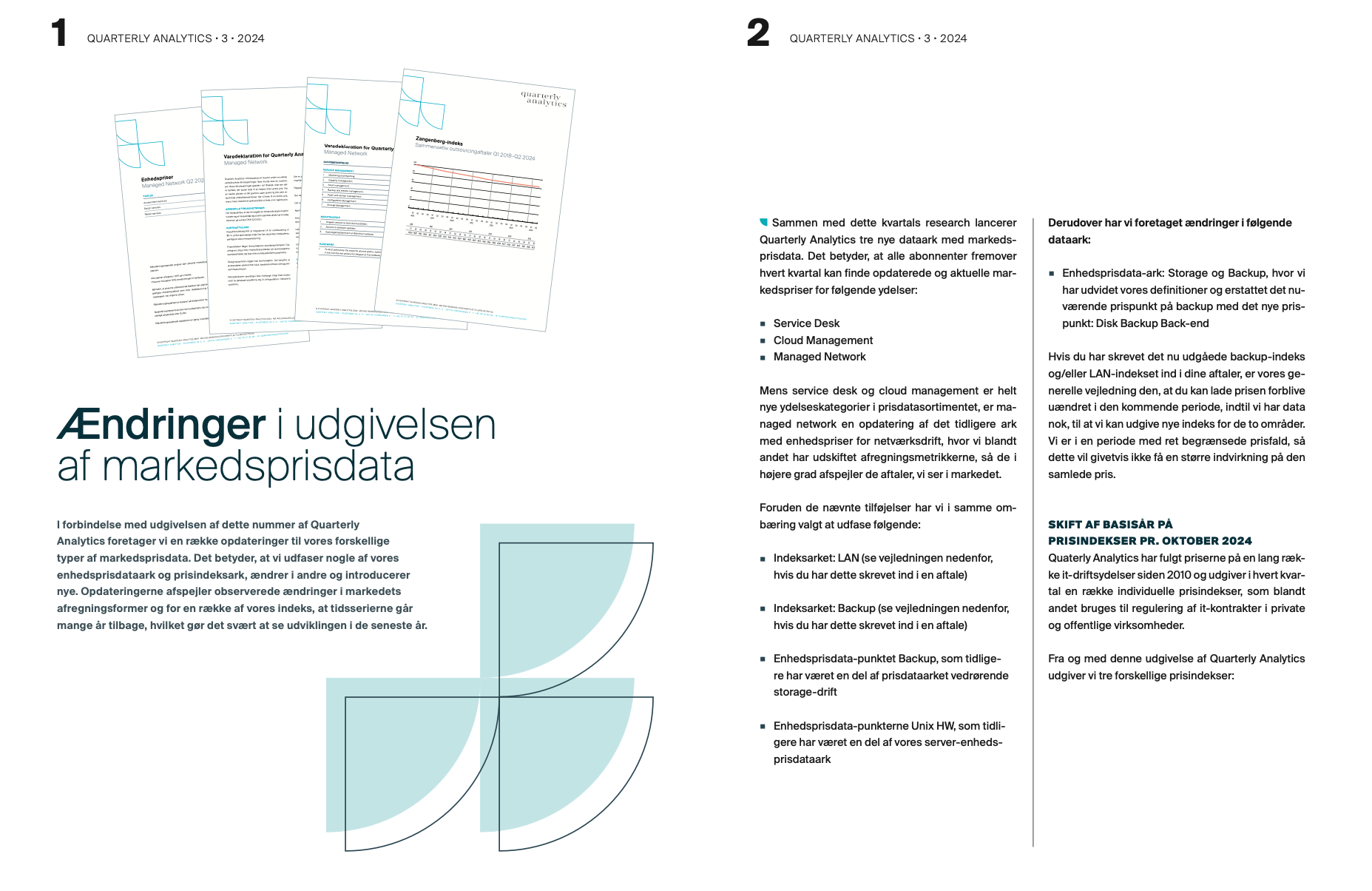 I forbindelse med udgivelsen af dette nummer af Quarterly Analytics nr. 3 2024 foretager vi en række opdateringer til vores forskellige typer af markedsprisdata. Det betyder, at vi udfaser nogle af vores enhedsprisdataark og prisindeksark, ændrer i andre og introducerer nye. Opdateringerne afspejler observerede ændringer i markedets afregningsformer og for en række af vores indeks, at tidsserierne går mange år tilbage, hvilket gør det svært at se udviklingen i de seneste år.