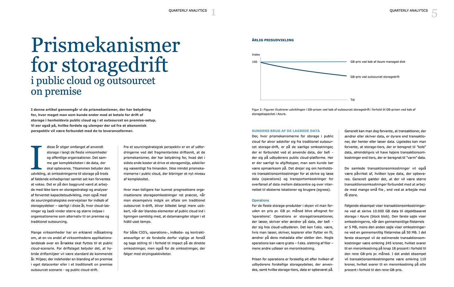Denne artikel gennemgår prismekanismerne, der har betydning for storagepriserne i henholdsvis et public cloud og i et traditionelt outsourcet on premise-setup. Den ser på hvilke fordele og ulemper, der ud fra et økonomiskperspektiv er forbundet med de to leveranceformer, samt hvilke af de beskrevne prismekanismer, der er særligt vigtige at være opmærksomme på, når der skal træffes en beslutning om sourcing af virksomhedens storagedrift.