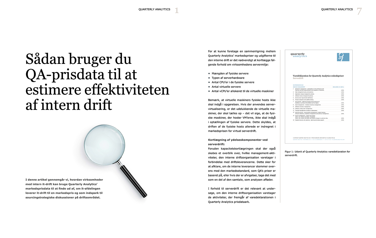 Spørgsmålet om it-drift skal varetages internt eller outsources er tilbagevende samtale mellem it-ledere og organisationernes øverste ledelse. Derfor giver det god mening løbende at trykprøve, om den del af virksomhedens drift, der er intern, er økonomisk effektiv, og om det, der leveres på den interne drift, møder den standard, der er i markedet. Her kan Quarterly Analytics’ nøgleprisdataark med fordel kan bringes i spil som indspark.