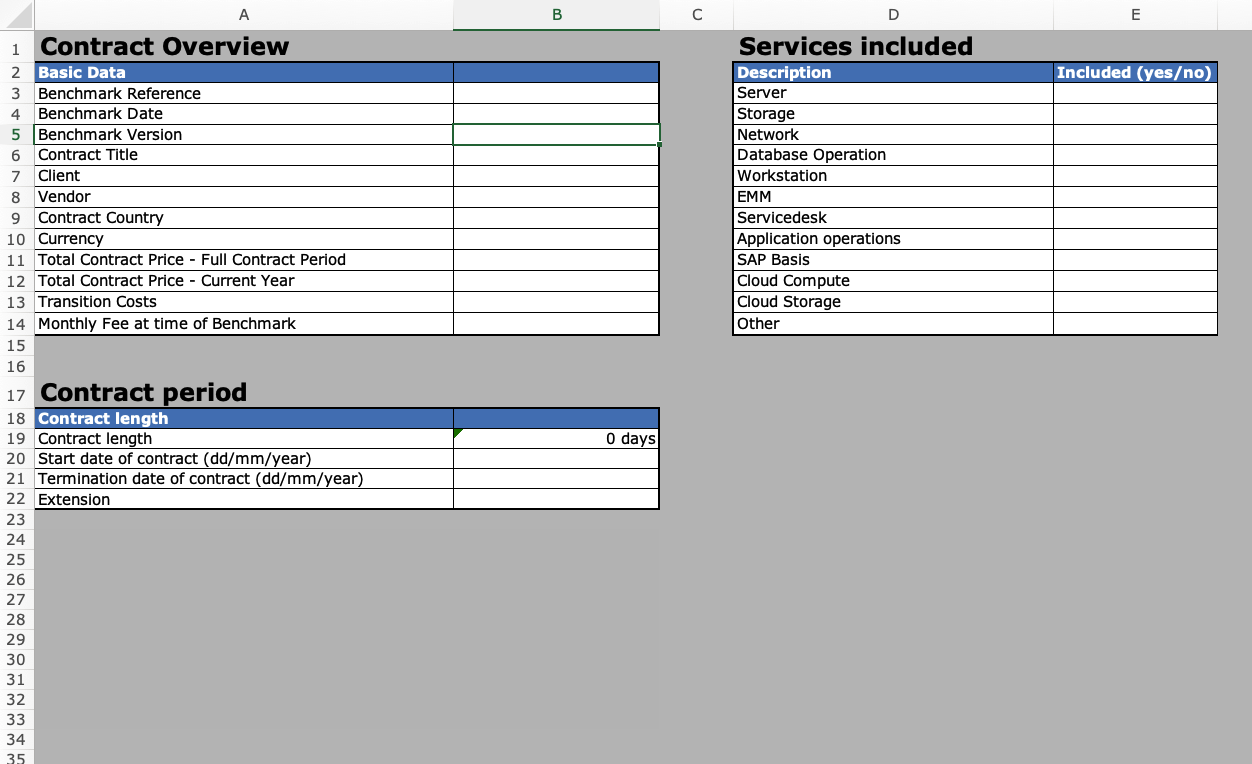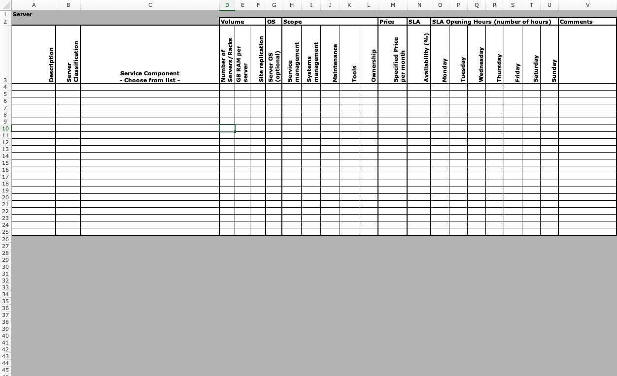 Dette værktøj er et excel-ark til kortlægning og nedbrydning af komplet it-kapacitet og tilhørende kontratvilkår f.eks. i en kontrakt eller i hele it-afdelingens setup.