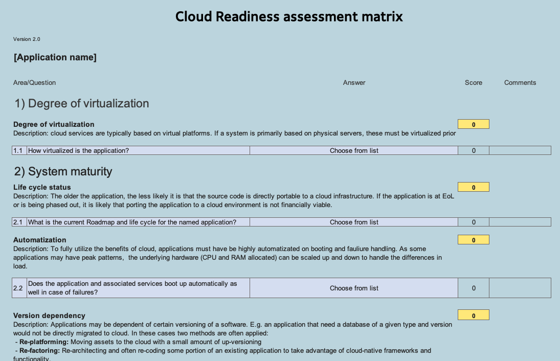 Cloud readiness-værktøjet et indikativt værktøj, der kan bruges til at vurdere enkelte applikationers egnethed i forhold til en cloud-migrering. Værktøjet kan f.eks. bruges i forbindelse med en cloud assessment, hvor det kan danne udgangspunkt for en indledende vurdering af virksomhedens applikationslandskab med henblik på af finde egnede kandidater til cloud-migrering.